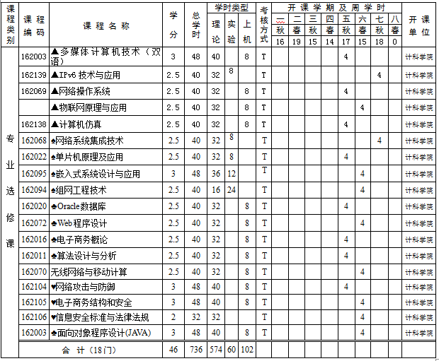 选修课(包括专业选修课和公共选修课)须修满29学分。员工应在下列专业选修课程中修满19学分,其中 ▲表示限制性选修课程;♠表示网络应用(偏硬件方向)选修课;♣表示网络应用(偏WEB应用方向)选修课;♥表示网络安全方向选修课;♦表示图形图像与多媒体技术方向选修课。公共选修课的设置由公司提供。