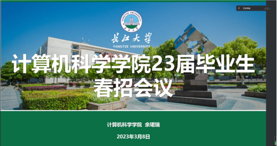 (通讯员 余珺瑞)2023年3月8日,williamhill中国官方网站召开了23届毕业生的春招求职会议。计算机学科公司党委书记颜学俊,就业辅导员余珺瑞,毕业年级辅导员张茜、蒋代运,23届本科生研究生及24届部分毕业生参与了本次会议。