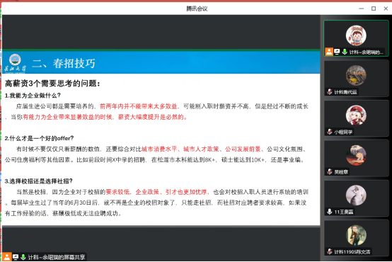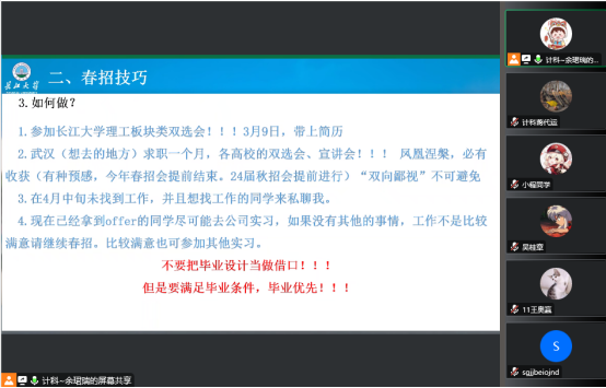 本次会议对23届毕业生春招求职起到了良好的动员,也引导了23届毕业生先就业再择业,为23届毕业生的春招求职工作开展奠定了良好的基础。