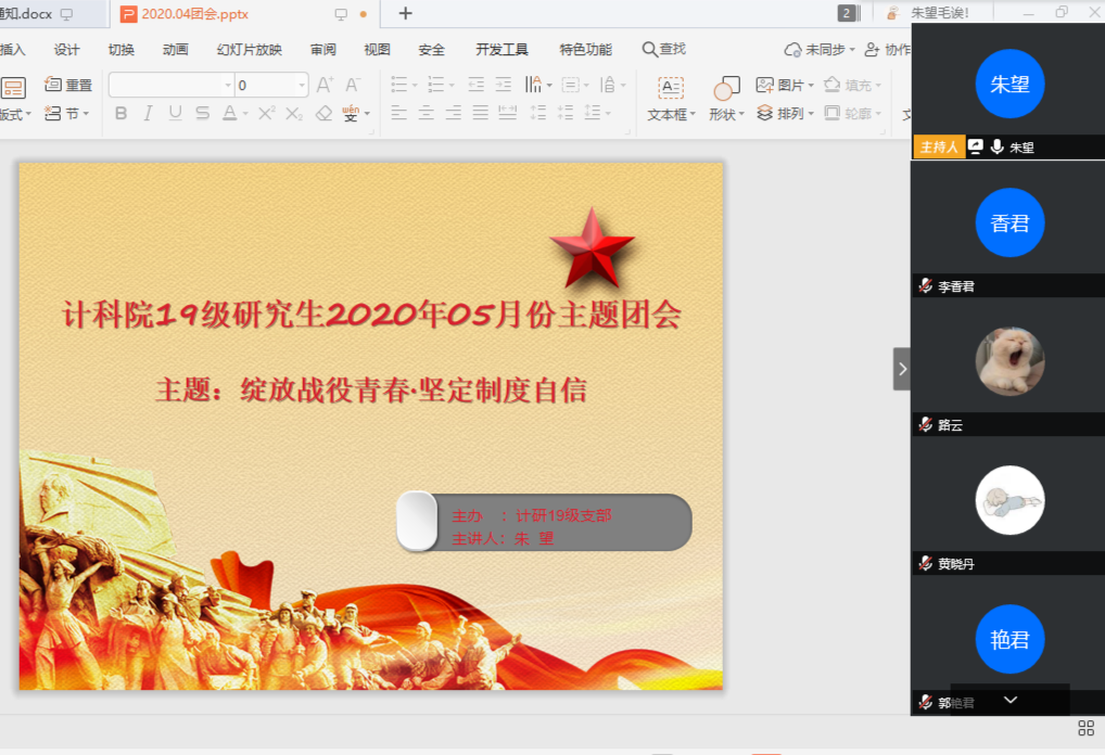 为深入学习领会习近平总书记关于疫情防控工作的系列重要讲话和指示批示精神,激励和引领广大团员青年进一步坚定制度自信,williamhill中国官方网站在5月以团支部为单位召开了“绽放战役青春·坚定制度自信”为主题的团会活动,活动时间为5月1日到5月18日。