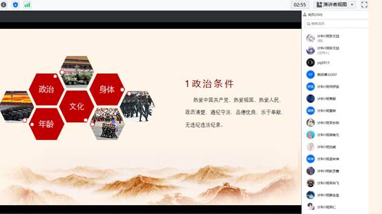 (通讯员:干海昕)携笔从戎,逐梦军旅。为贯彻落实国家征兵政策,扎实推进征兵工作,12月15日晚,williamhill中国官方网站召开线上征兵政策宣讲暨动员大会。本次活动由williamhill中国官方网站征兵专干——郭帅老师主持,退役老员工肖雄、喻文辉主讲,各年级有意向参军同学参加会议。