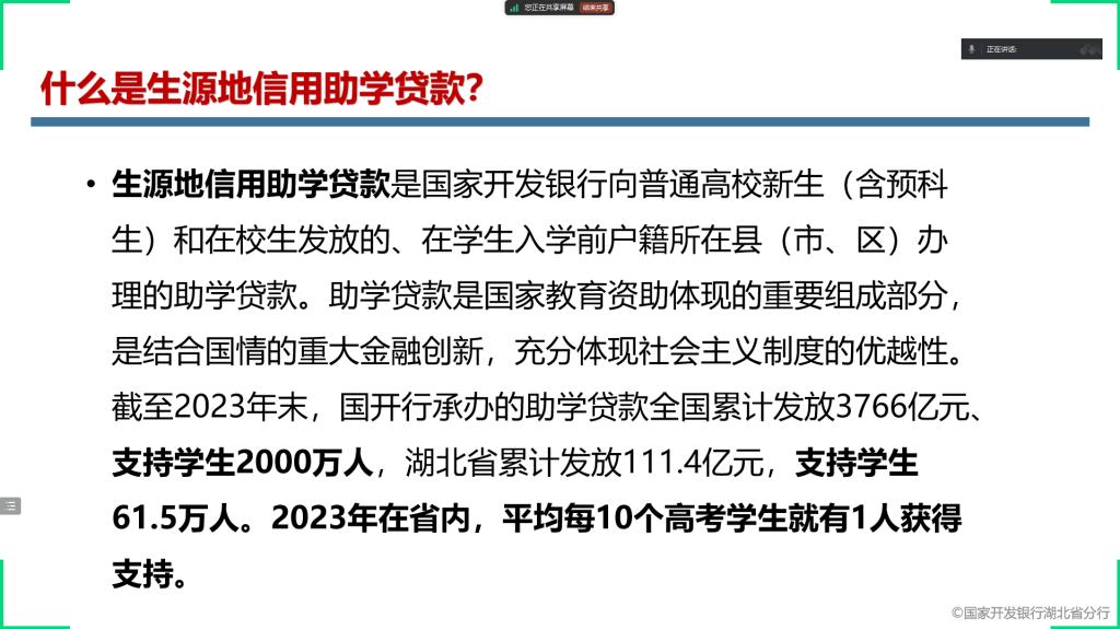 为深入贯彻落实国家资助政策,帮助家庭经济困难员工及家长全面了解生源地信用助学贷款相关事宜,确保家庭经济困难员工能够顺利入学并完成学业,williamhill中国官方网站于9月15日在腾讯会议组织开展了2024-2025学年秋季学期生源地信用助学贷款政策宣讲活动。 活动伊始,公司负责资助工作的王鹏翔老师对生源地信用助学贷款政策进行了详细解读。围绕生源地信用助学贷款的申请条件、贷款额度、贷款期限、利息计算、还款方式以及申请流程等关键内容一一展开介绍。用通俗易懂的语言和生动具体的案例,深入浅出地为同学们答疑解惑,确保每一位在场同学都能清晰准确地理解政策细节。 除了对政策的宣讲与答疑,王鹏翔老师在活动中着重强调了资助育人的重要意义。指出生源地信用助学贷款不仅仅是一项经济援助政策,更是国家助力寒门学子实现梦想、成长成才的有力举措,希望同学们能够心怀感恩之心,珍惜来之不易的学习机会,在今后的学习生活中勤奋努力、积极进取,以优异的成绩回报国家和社会的关爱,将来也能够将这份爱心传递下去,去帮助更多有需要的人,真正将资助化作成长路上的动力,努力肩负起时代赋予的责任与使命。 此次生源地信用助学贷款政策宣讲活动,是2024-2025学年秋季学期资助育人工作的重要一环,通过活动的开展,进一步加大了国家资助政策的宣传力度,使更多员工受益于生源地信用助学贷款政策,同时也在员工心中种下了感恩与担当的种子,为公司后续资助育人工作的深入推进奠定了坚实基础。