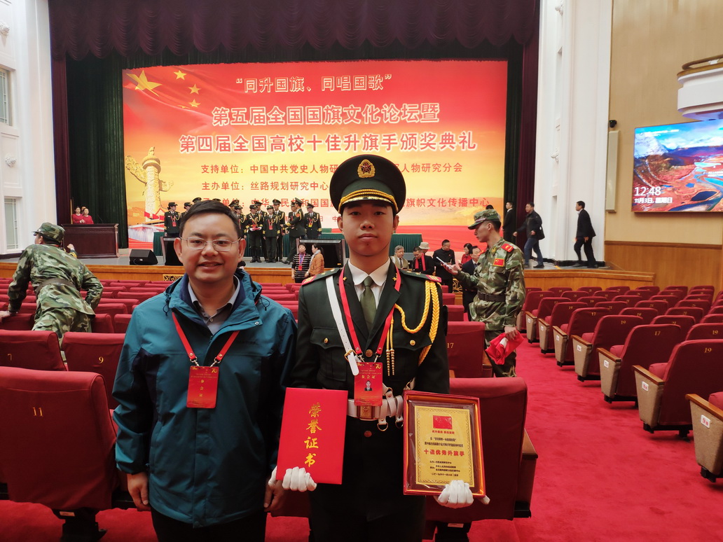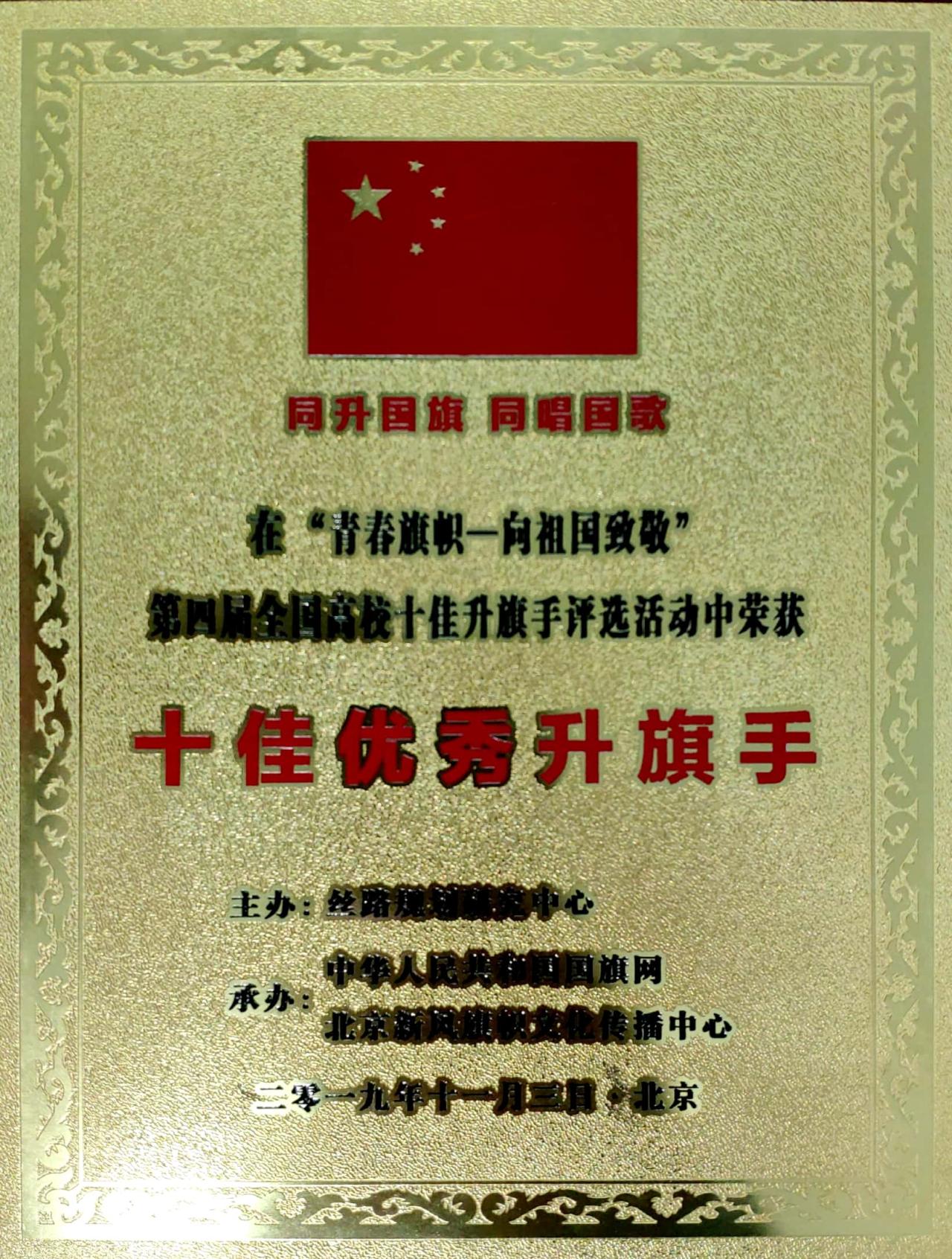 据介绍,此次活动是由丝路规划研究中心主办,中华人民共和国国旗网、中国旗帜学研究中心、北京新风旗帜文化传播中心承办,以传承红色基因,厚植爱国情怀为宗旨,推动公司国旗文化进一步普及规范为目的。本次活动由“同升国旗、同唱国歌”第六届全国公司升旗手交流展示和“青春旗帜•向祖国致敬”第四届全国高校十佳升旗手评选活动两个部分组成。刘明圣同学在知识竞赛、演讲比赛、升旗手动作比赛等多项评比过程中表现优异,成绩突出,他对国旗文化的了解,升旗动作的规范,坚忍不拔的毅力,获得了在场评委的一致称赞。
