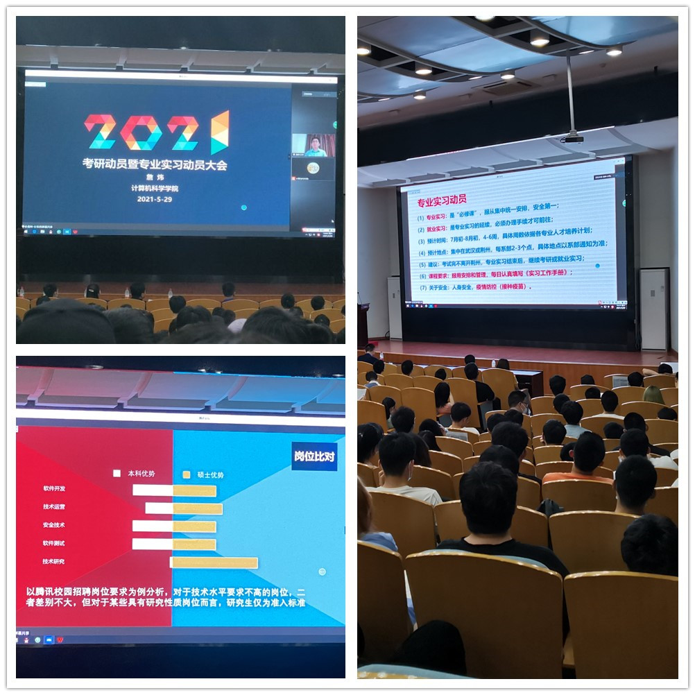 会议第一项,由公司分管教学工作的副经理詹炜做实习、考研动员。詹经理首先结合当下形势,对计算机大类专业毕业求职优势和国家对于创新性人才的需求进行了分析,鼓励大三员工认清形势后结合自身的情况去思考如何抉择就业和考研。同时结合近五年来全国研究生报考人数的情况和往年公司毕业生报考研究生的情况,希望广大计科学子能够认清形势,脚踏实地,迎接战斗。接下来,詹经理说明了专业实习和就业实习的区别,并对公司的专业实习工作安排进行了说明,特别强调了疫情防控形势下需要注意的人身安全问题。