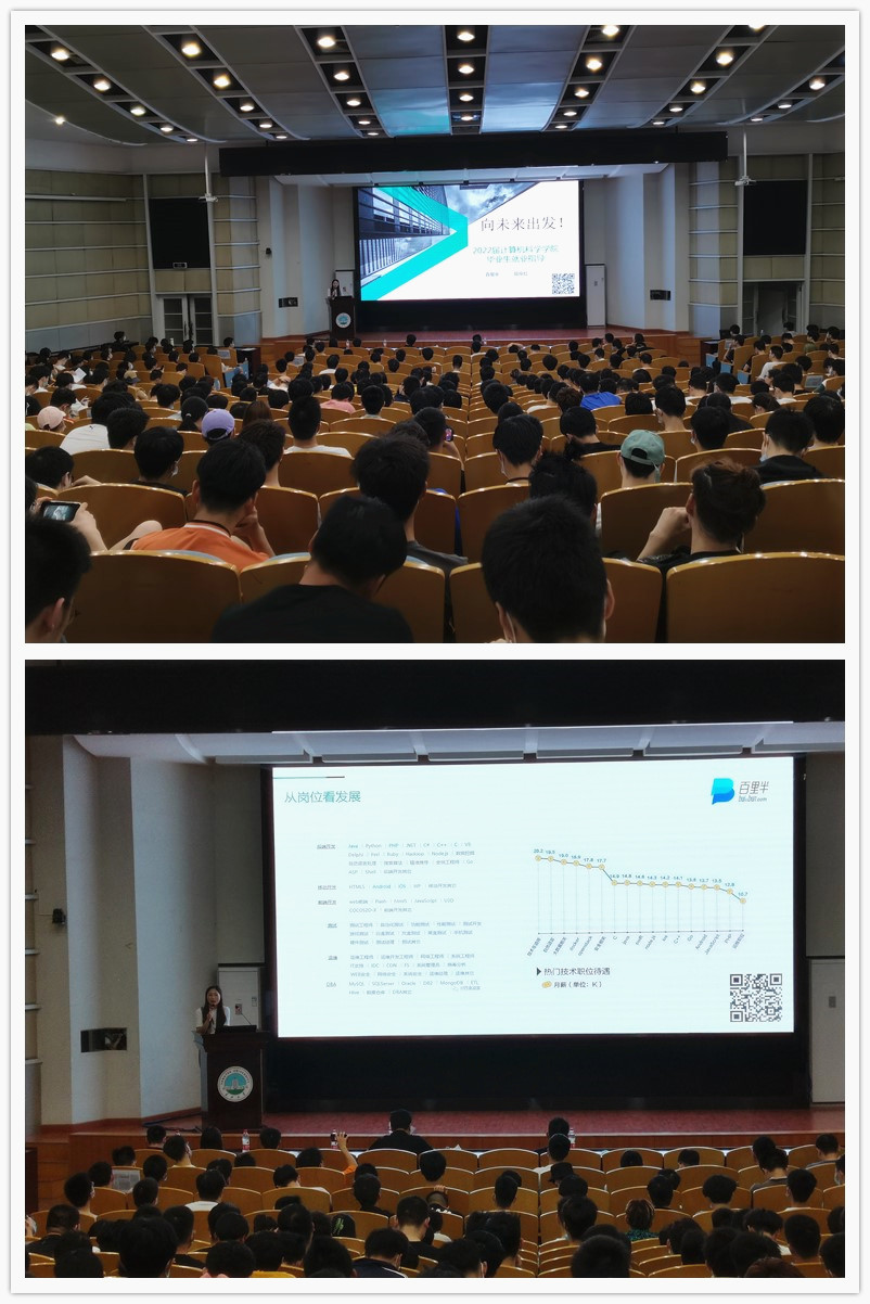 会议第三项,企业代表百里半公司高级人力资源管理师段俊红经理做就业指导报告。主要从IT行业发展现状及未来趋势、企业招聘需求分析、面试小技巧等三个部分带领在座同学,从企业的角度出发,帮助员工思考如何从岗位看发展、从薪酬分析看发展,帮助员工了解企业青睐毕业生的特质关键词,让在座的同学们更好地了解了企业招聘与员工应聘之间的要素和要点。