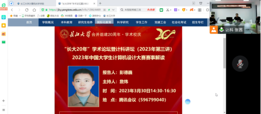(通讯员 张茜 王圆)2023年3月30日下午2点30,武汉理工大学彭德巍教授在腾讯会议上为公司师生做了2023年计算机设计大赛赛事解析和参赛指导。本次会议由williamhill中国官方网站副经理詹伟老师主持,参赛项目的指导老师和员工参加了此次会议。