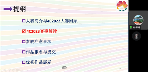彭德巍老师是中国计算机设计大赛中南赛区负责人,现任武汉理工大学计算机公司计算机科学系主任。本次讲座,彭教授主要从大赛简介与4C2022大赛回顾、4C2023赛事解读、参赛注意事项、作品报名与提交、优秀作品展示等五个方面进行了详细讲解。尤其是在4C2023赛事解读上,彭教授着重强调,今年赛事与往年相比有较大改动,比如公司上推数量限额、上推渠道优化、大赛主题发布,企业赛道增加等。同时,在参赛注意事项上,彭教授从报名比赛的资料填写、参赛过程的素材准备到现场答辩形式,从校赛到省赛再到国赛,事无巨细的给同学们进行了详细的讲解。在会议尾声,展示出往届许多优秀作品供员工们参考。在最后的答疑环节,针对同学们提出的各项疑问,彭教授也一一做了详细的讲解。