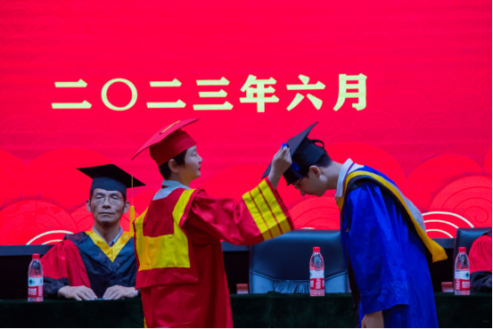 最后,毕业生学位授予仪式环节,同学们互正衣冠,陆续上台与导师握手拥抱,经理亲自为同学们拨穗,师生互道珍重并合影留恋,象征顺利毕业的导师拨穗仪式在感动中落幕。