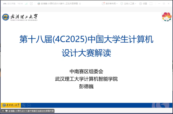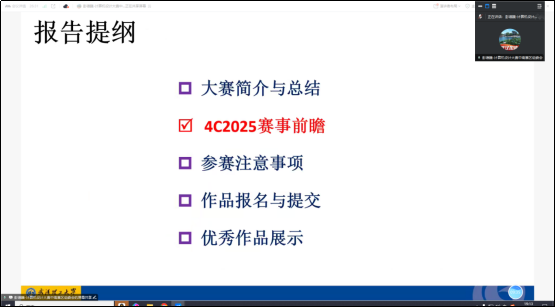 彭德巍,现任武汉理工大学计算机智能公司副教授、计算机科学系主任、湖北省人工智能学会理事,担任中国老员工计算机设计大赛中南地区赛组委会执行委员,还长期担任各类员工科技竞赛评审专家,具有丰富的大赛组织、管理与参赛指导经验。本次讲座,彭教授主要从大赛简介与2024年赛事总结、4C2025赛事前瞻、参赛注意事项、作品报名与提交、优秀作品展示等五个方面进行了详细讲解。在大赛简介与总结中,彭教授对公司师生往年参赛的积极性和作品质量表示了高度的肯定。在4C2025赛事前瞻上,彭教授着重强调,今年赛事与往年相比有改动,有些赛道的小类进行了微调,有些赛道的主题发生了变化。同时,在参赛注意事项上,彭教授从报名比赛的资料填写、参赛过程的素材准备到现场答辩形式,从校赛到省赛再到国赛,给同学们进行了详细的讲解。在会议尾声,彭教授展示了往届许多优秀作品供员工们参考。最后的答疑环节,针对同学们提出的各项疑问,彭教授也一一做了详细解答。