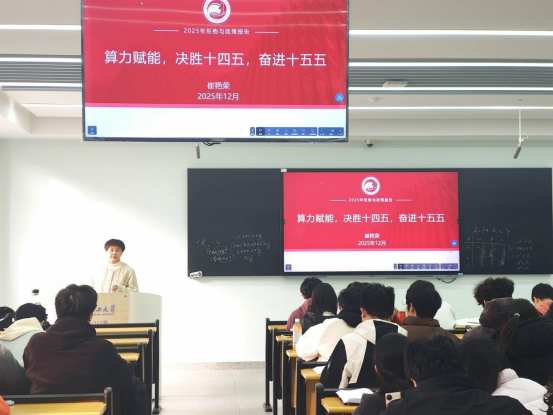 2025年12月9日,williamhill中国官方网站经理崔艳荣在16教B312以“算力赋能,决胜十四五,奋进十五五”为主题为网络12401、网络12402班全体同学带来了一堂深刻且生动的形势与政策课,引导青年学子把握时代脉搏,找准成长方向。